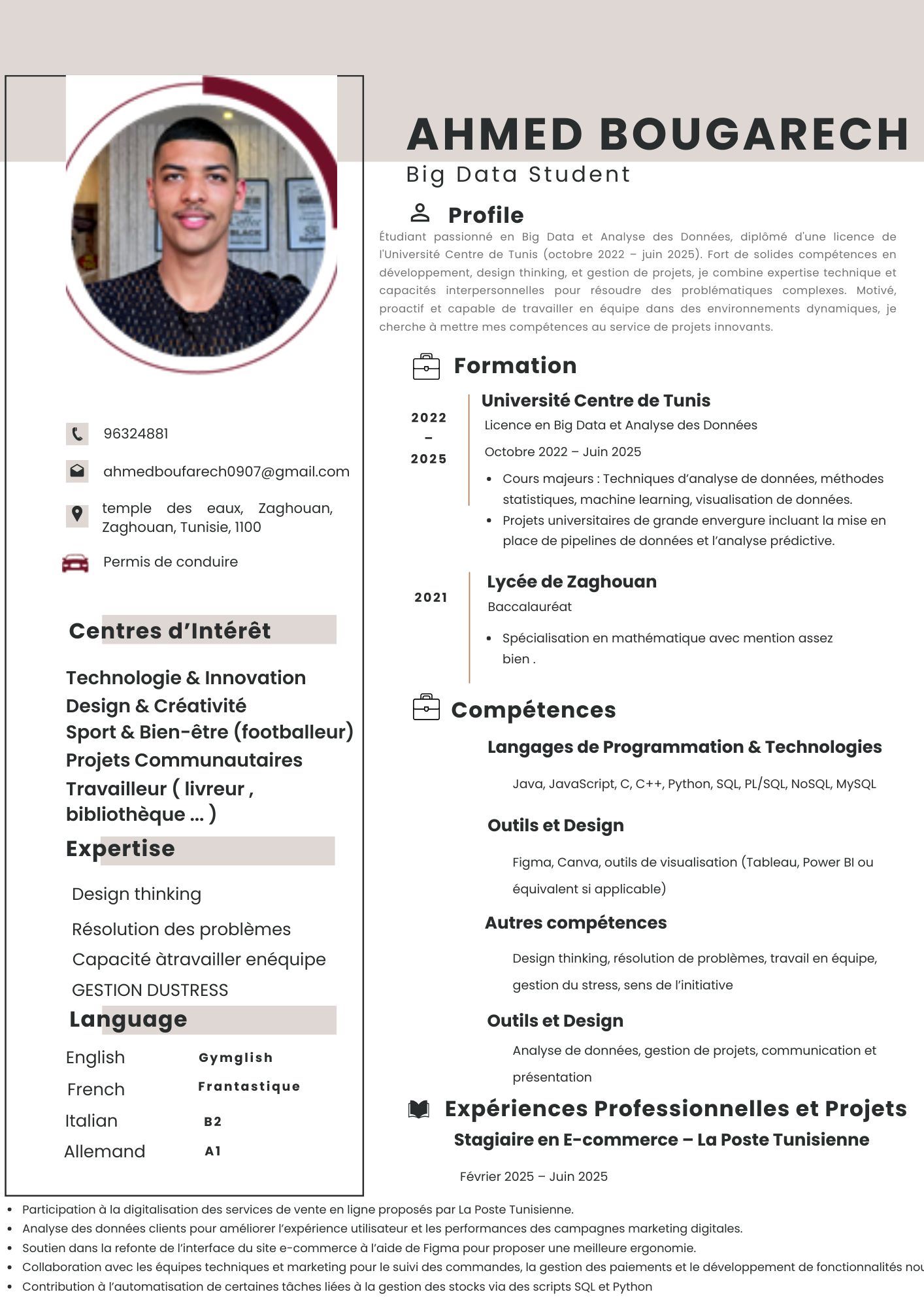 Actuellement étudiant en Licence de Big Data et Analyse des Données à l’Université Centre de Tunis, je suis à la recherche d’une opportunité qui me permettrait de mettre en pratique mes compétences techniques et d’approfondir mon expérience dans le domaine de l’analyse de données, du machine learning et de la gestion de projets. Passionné par les technologies émergentes et la valorisation des données, je suis motivé à rejoindre une équipe dynamique où je pourrai contribuer à des projets concrets et innovants.Au cours de ma formation, j’ai développé de solides compétences en techniques d’analyse statistique, en visualisation de données, en conception de pipelines et en programmation (Java, SQL, Python, C++). Mon stage au sein de La Poste Tunisienne m’a permis d’appliquer ces connaissances dans un environnement professionnel réel, notamment à travers la digitalisation des services en ligne, l’analyse de données clients et l’optimisation de l’interface e-commerce. Ces expériences m’ont appris à travailler en équipe, à résoudre des problématiques complexes et à gérer des projets de manière efficace.
